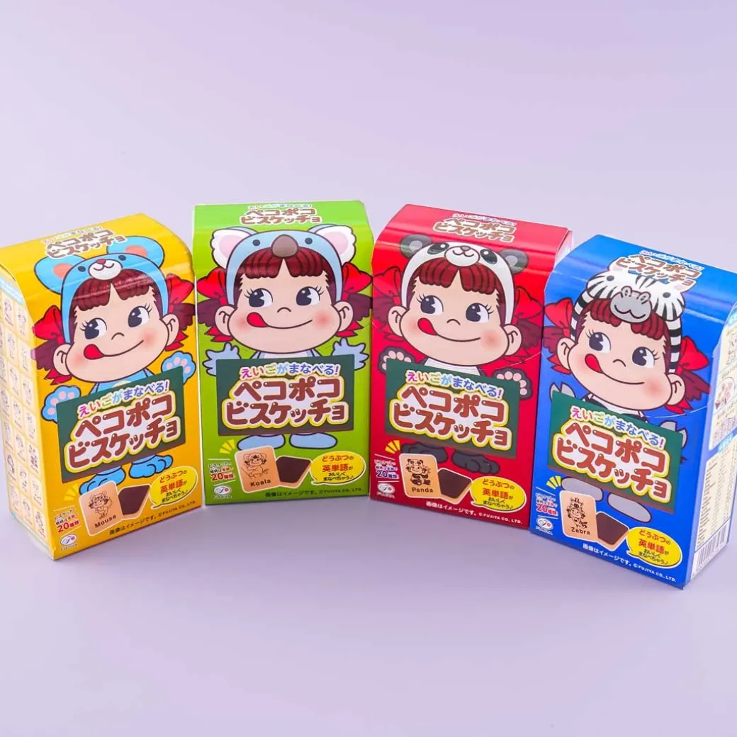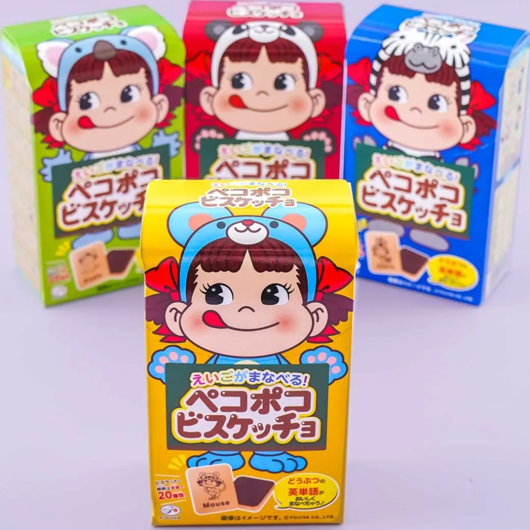 - A box of chocolate-filled biscuits featuring prints of Peko-chan wearing different animal costumes