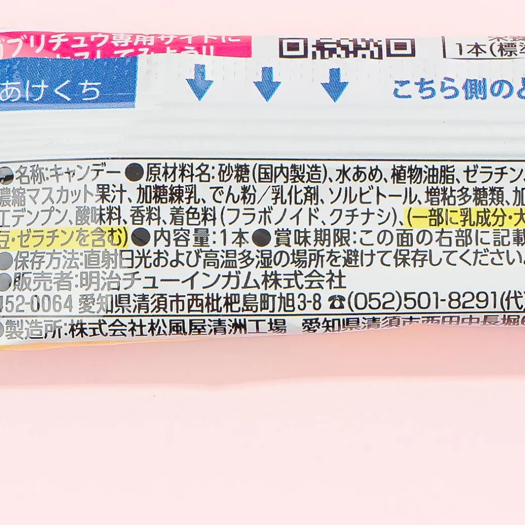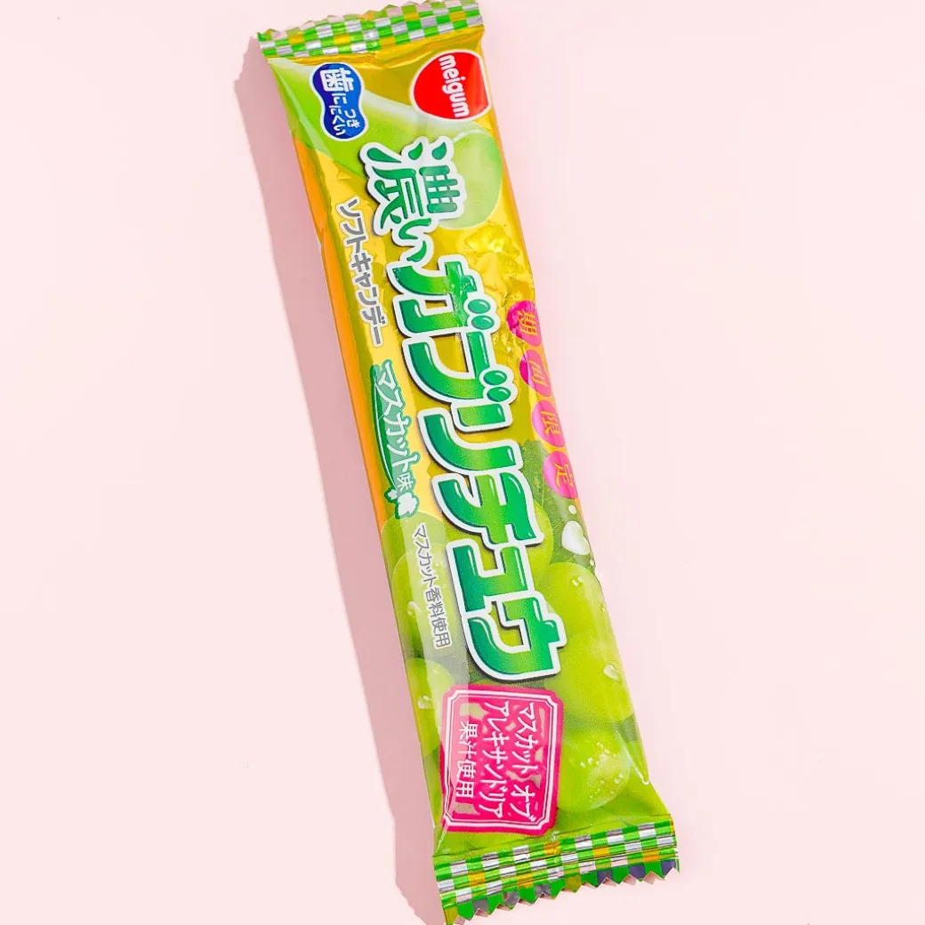 This dark premium bar of soft chewy candy is made with actual fruit juice. Enjoy the taste of the muscat grapes of Alexandria with every chewy bite you take! It’s the perfect candy to indulge in.