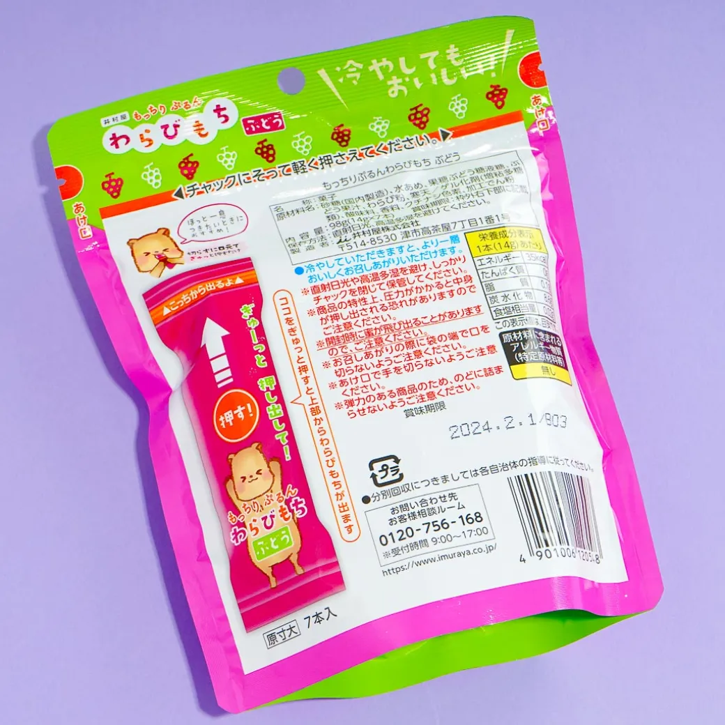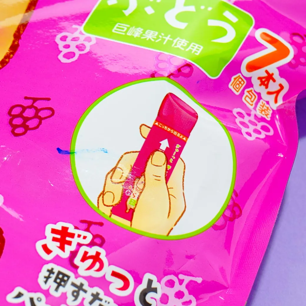 Snack on these yummy one-push jelly treats while you’re on the go! These sweets are made of refreshing grape juice. The packaging features a kawaii bear holding a huge jelly stick.