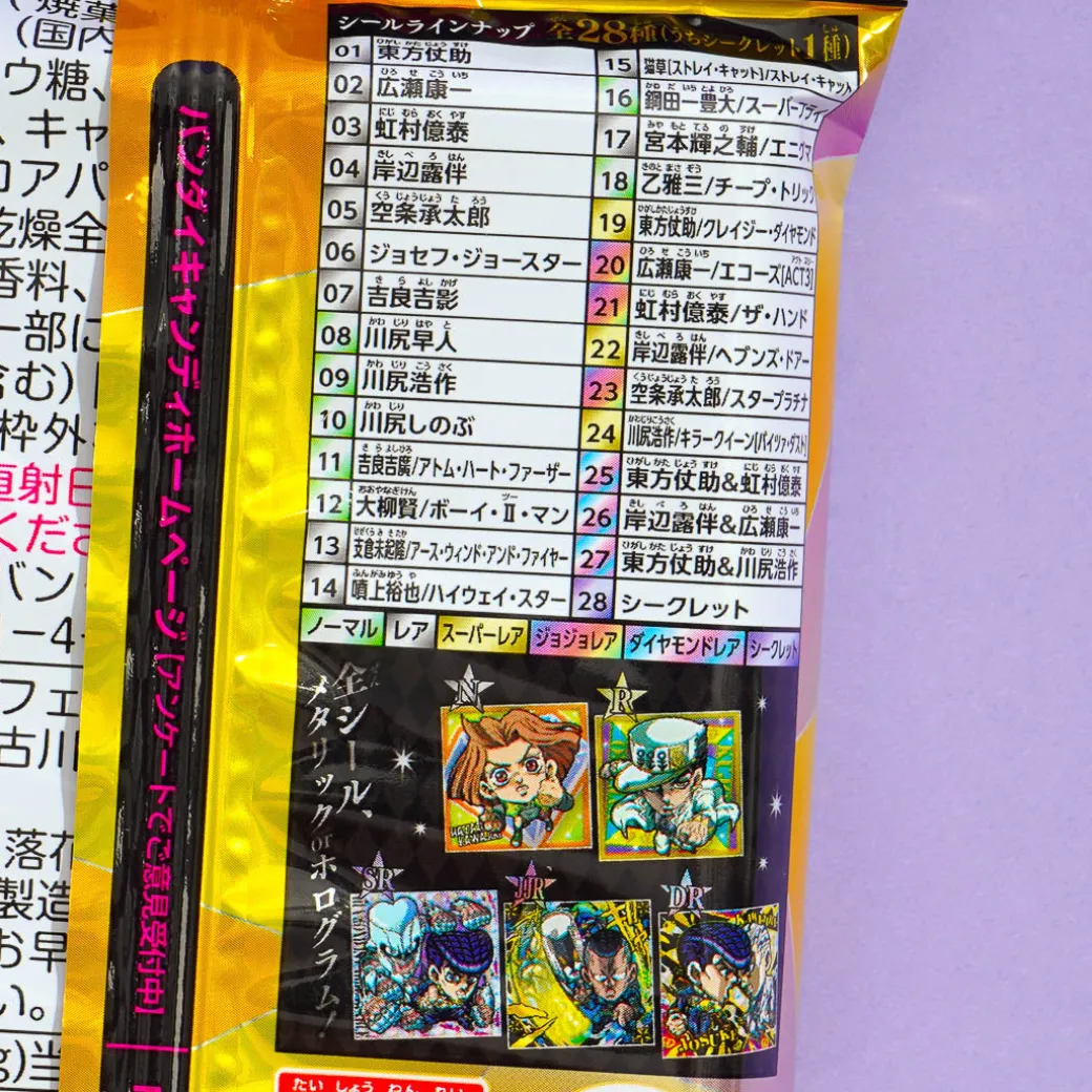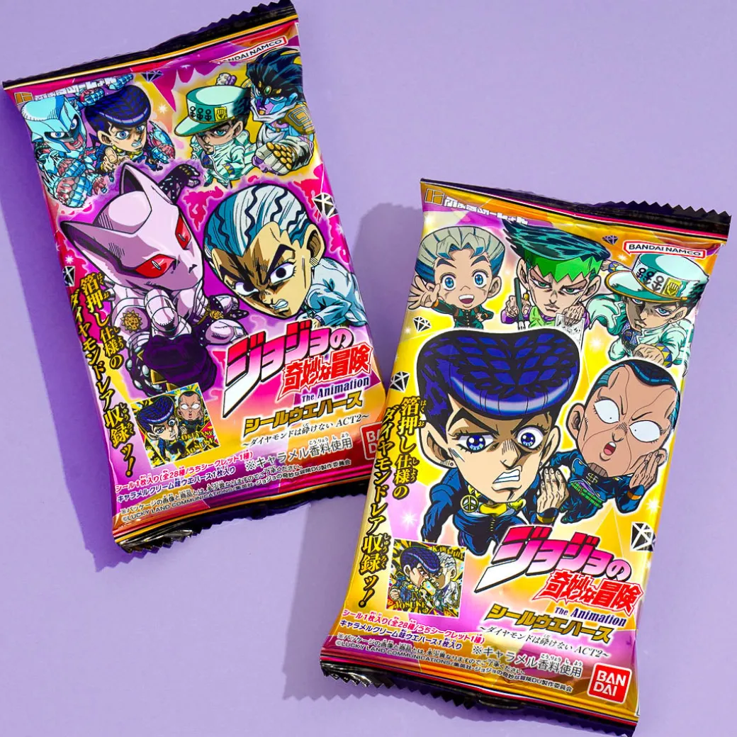 This fifth edition of Bandai’s Niformation Jojo’s Bizarre Adventure wafer snack features illustrations from the animated series’ “Diamond Is Unbreakable Act 2.” The pack contains a delicious caramel cream-flavored wafer and a collectible sticker. Have fun collecting all 35 types while enjoying this snack!