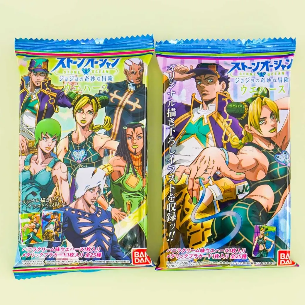 - A pack containing a JoJo’s Bizarre Adventure: Stone Ocean card with wafer