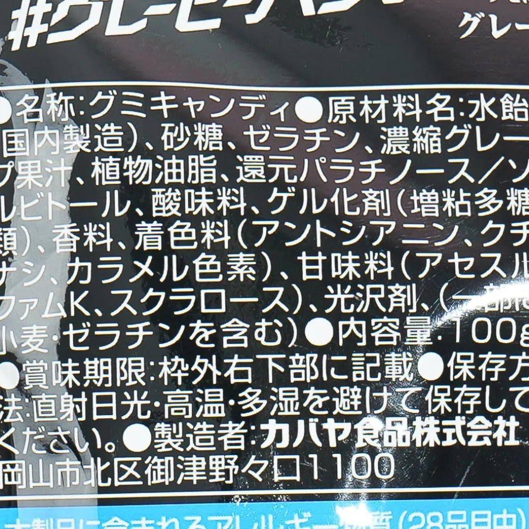 Have fun chewing this delicious gummy candy! It features two kinds of grape flavors — one with a slight sweetness and the other with a refreshingly sour taste.