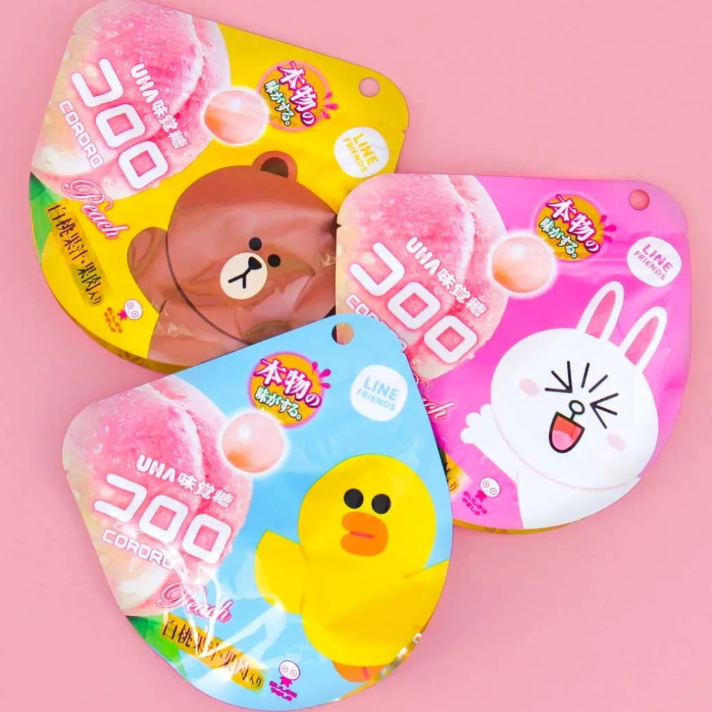 - A pack of Line Friends-themed gummy candies with a peach flavor