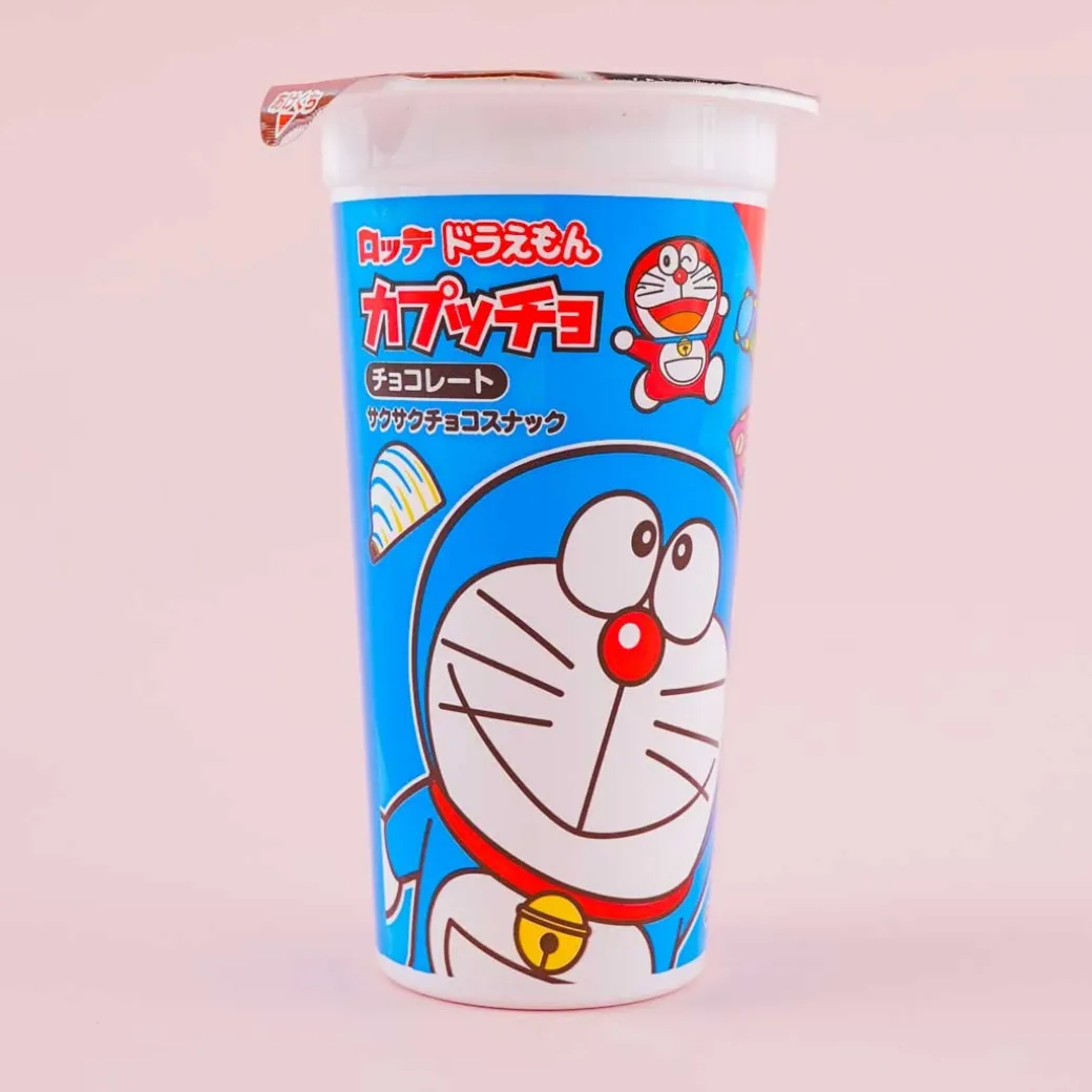 - A cup of chocolate candy and chocolate-coated crisp corn puffs illustrated with Doraemon