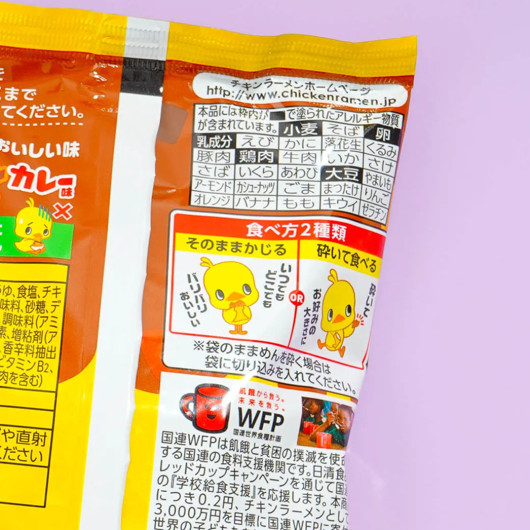 Enjoy nibbling on this ramen noodle snack! It’s a chicken ramen that can be eaten as is so there’s no need for hot water. This crispy snack is seasoned with soy sauce-based chicken soup and curry powder.
