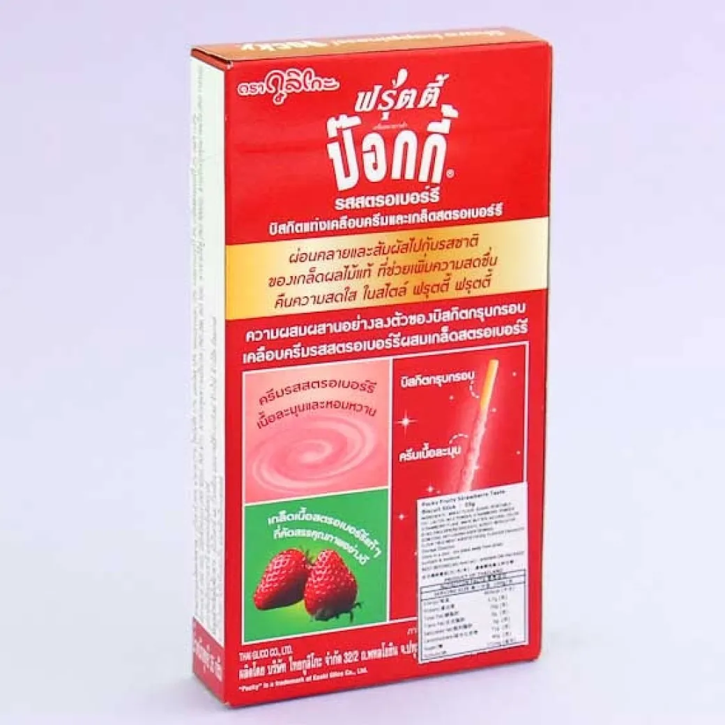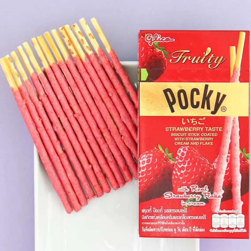- Pocky sticks coated with real strawberry flake in creamy topping