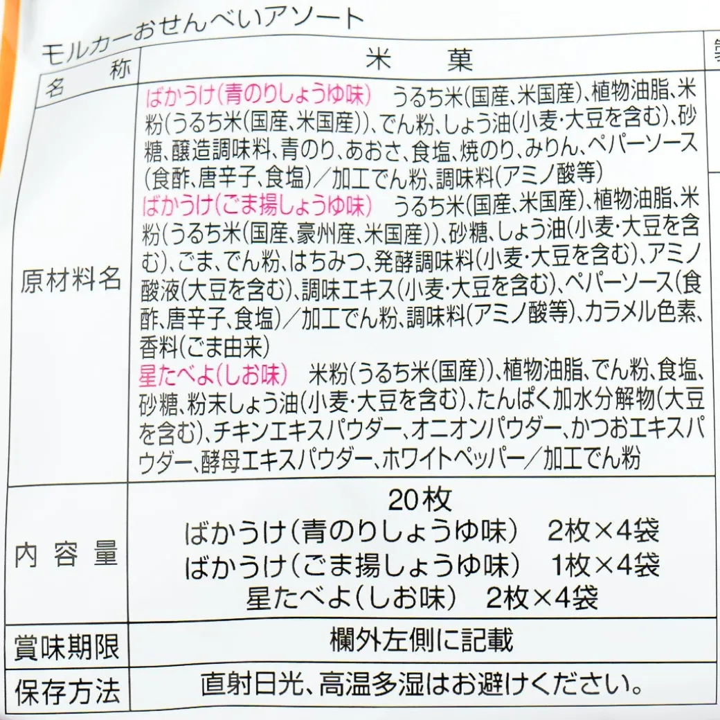 Enjoy different types of Befco rice crackers as your daily snack! This pack contains an assortment of banana-shaped and star-shaped crackers with various flavors. The packaging features the Japanese animation, “Pui Pui Molcar.”
