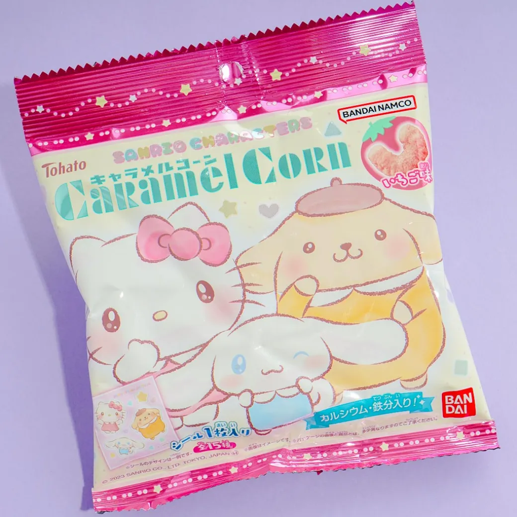 Enjoy the sweet taste of caramel with this pack of corn snacks! These puffy treats come in a Sanrio-themed bag with one surprise bonus sticker. Each puff is flavored with condensed milk and strawberry for a yummy sweet and sour taste.