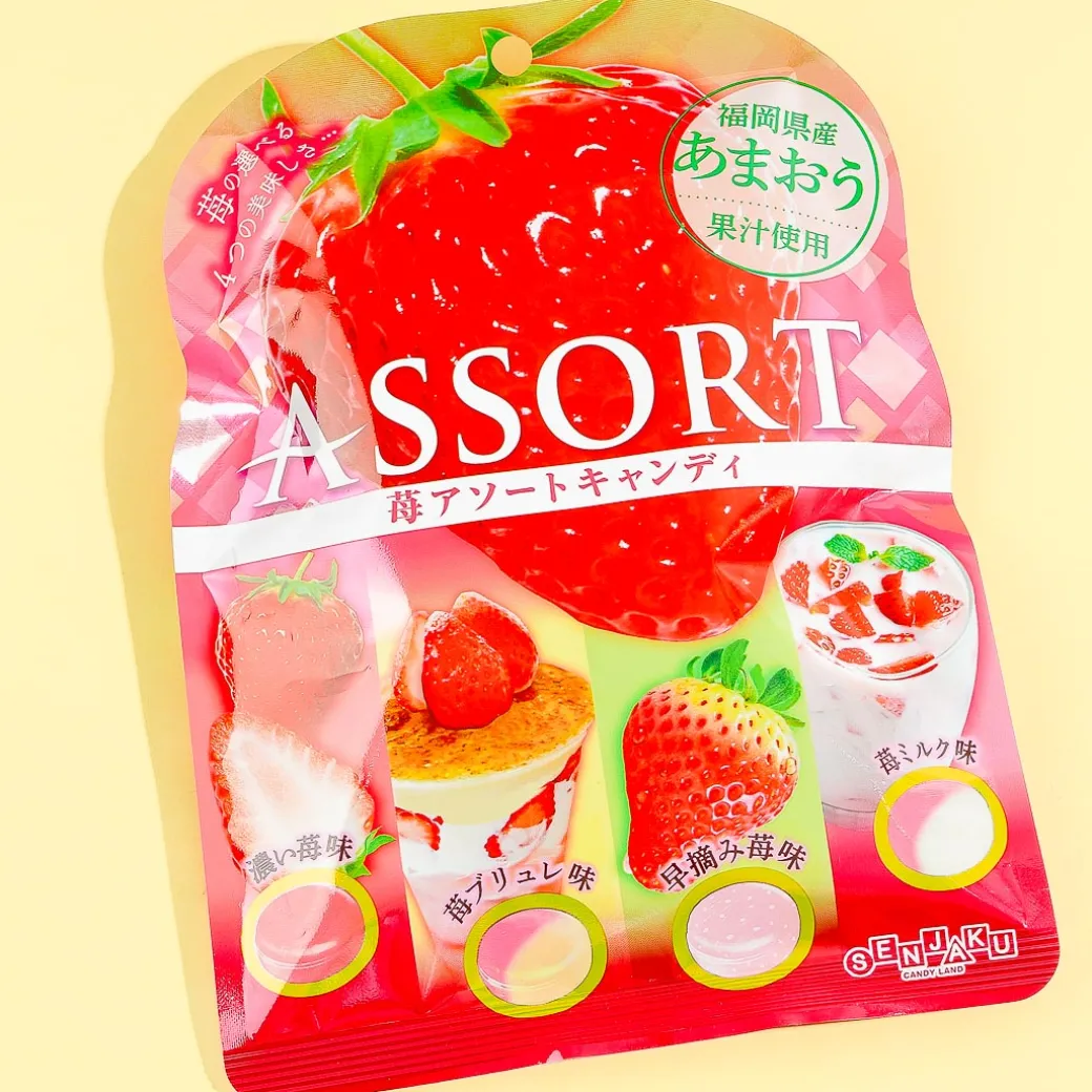 Enjoy four strawberry flavors in this pack of assorted yummy candies! The four flavors are Strong Strawberry, Strawberry Brulee, Early Picked Strawberry, and Strawberry Milk. These candies are made with Amaou strawberry juice!