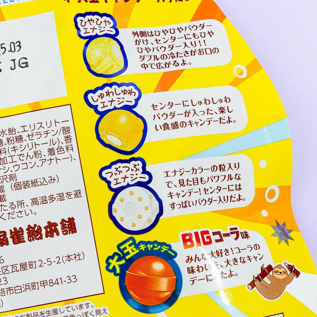 This pack of candy is the perfect pick-me-up treat to get you energized. Enjoy the three different types of energy drink flavors in the pack – hiyahiya energy drink, shuwashuwa energy drink , and tsubu-tsubu energy drink. You can also find one big large cola-flavored candy inside the pack!
