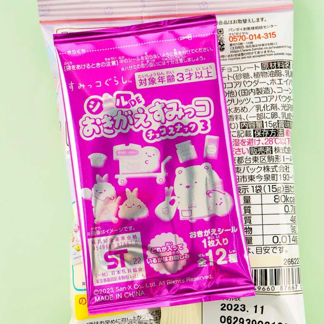 Take a quick break as you munch on these yummy chocolate-flavored corn snacks! These delicious treats come with a free Sumikko Gurashi character sticker sheet.