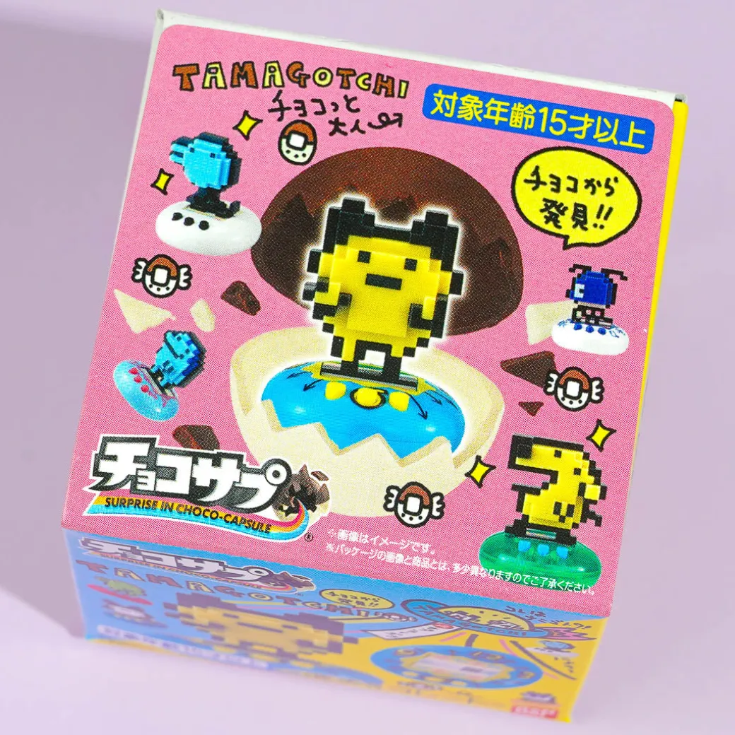 This milk chocolate treat is shaped like a gachapon or Japanese toy capsule! When you break down the chocolate, you’ll get a surprise Tamagotchi character mini figure and a bonus base that looks just like a Tamagotchi!