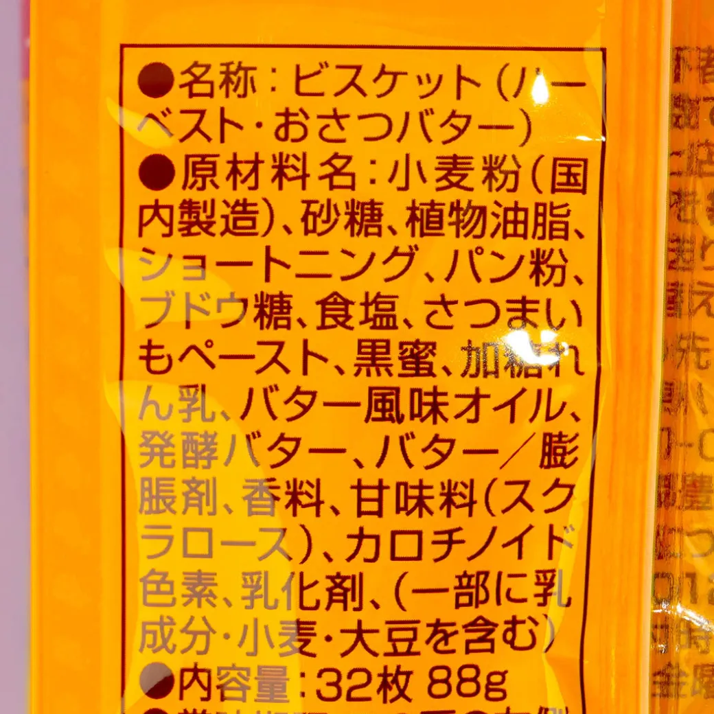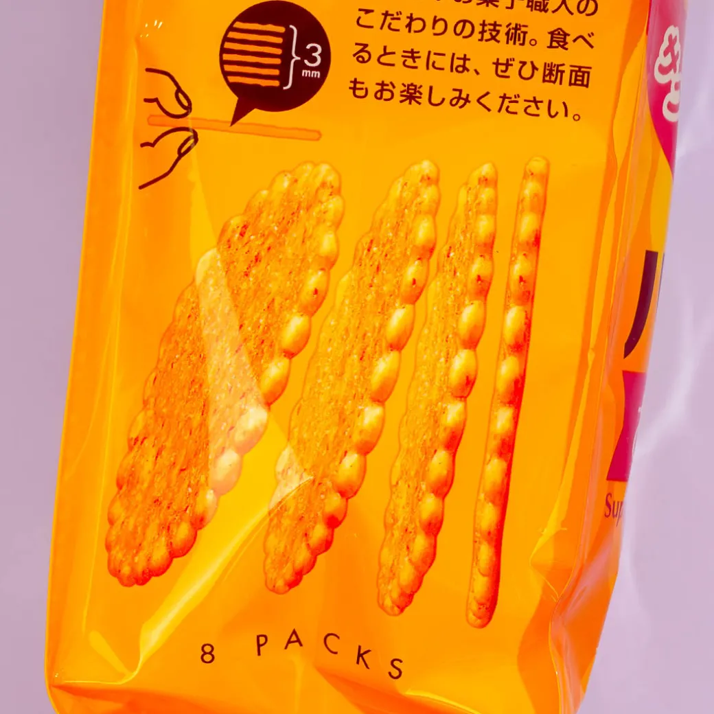 Nibble on this autumn-limited pack of delicious thin biscuits! These crispy treats are made by kneading together Osatsu sweet potato paste and fermented butter with delicious Tohato Smile Harvest biscuit dough. Pair these sweet and salty biscuits with your favorite drink!