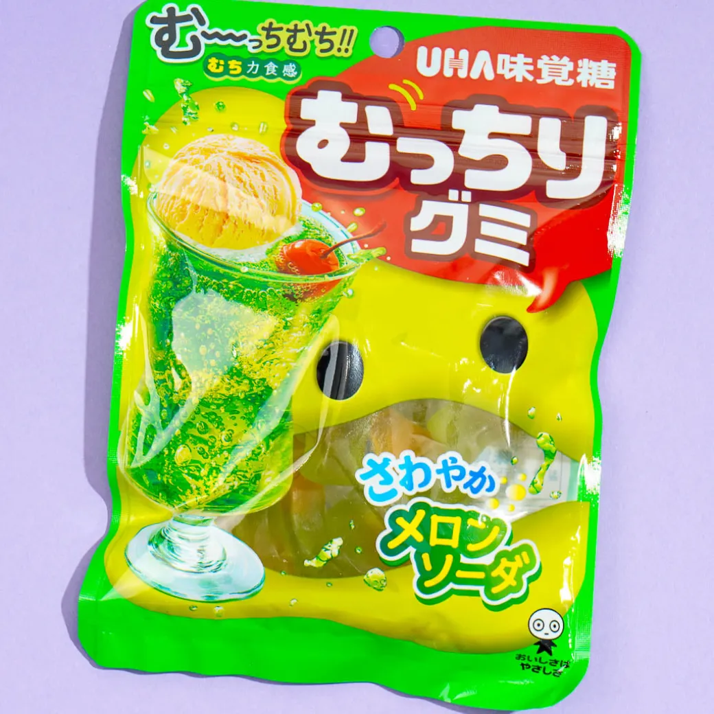 Melon soda, Japan’s classic carbonated drink flavor, can now be enjoyed in gummy candy! This bottle-shaped gummy has a unique texture with a firm and moderate chewiness so it can stay longer in your mouth. It comes in a resealable pouch so you can munch on some and save the rest for later.