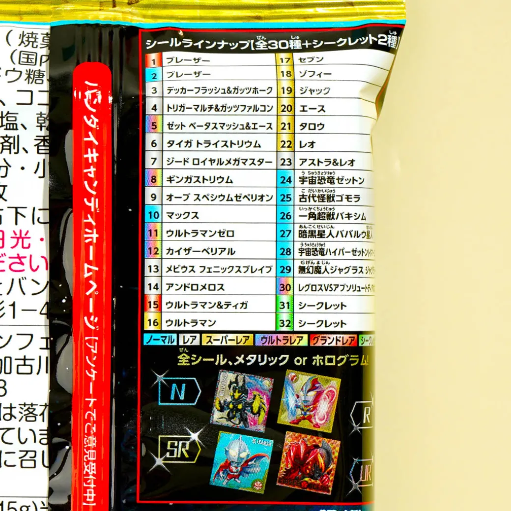 This cocoa cream-flavored wafer comes in packaging illustrated with Ultraman characters. You’ll get a collectible Ultraman sticker with this wafer pack! Surprise yourself with a random sticker design from a set of 32 when you order.
