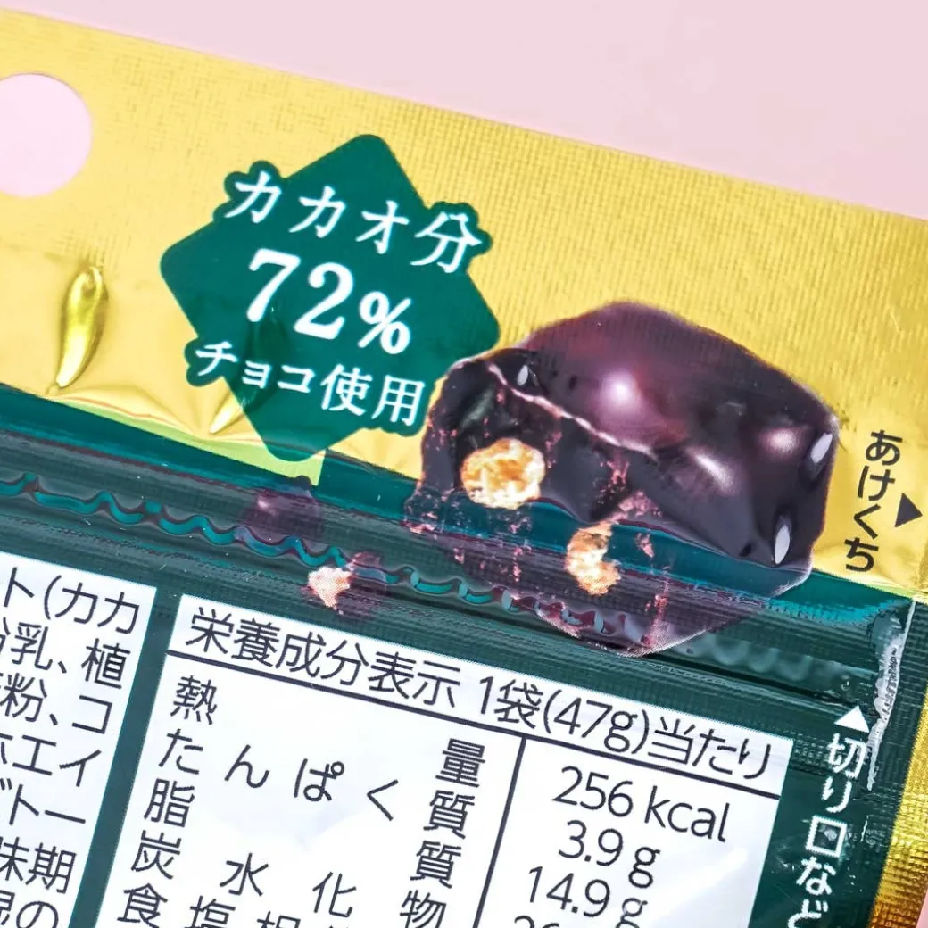 - A bag of crunchy chocolate snacks mixed with cookies, biscuits, and nuts coated with 72% cacao